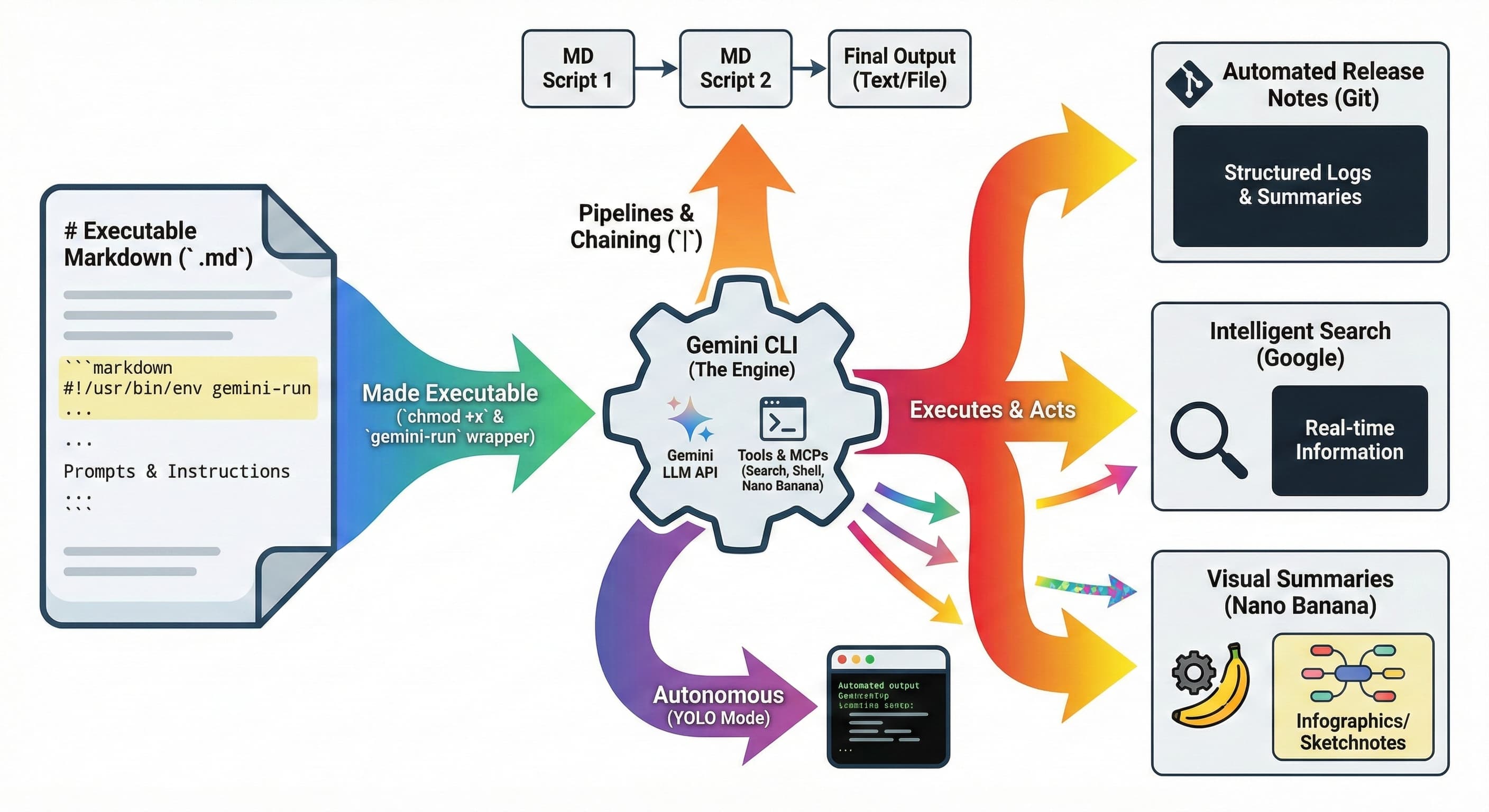 Because gemini-run supports stdin, you can chain multiple markdown scripts together or mix them with standard Unix tools.
