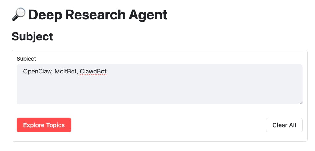 Jt.title("🔎 Deep Research Agent").use();