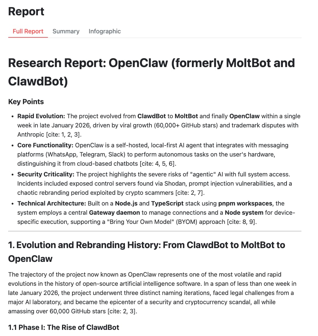 - Then the Deep Research agent kicks in, via the Gemini Interactions API, and spends a few minutes researching the topic.