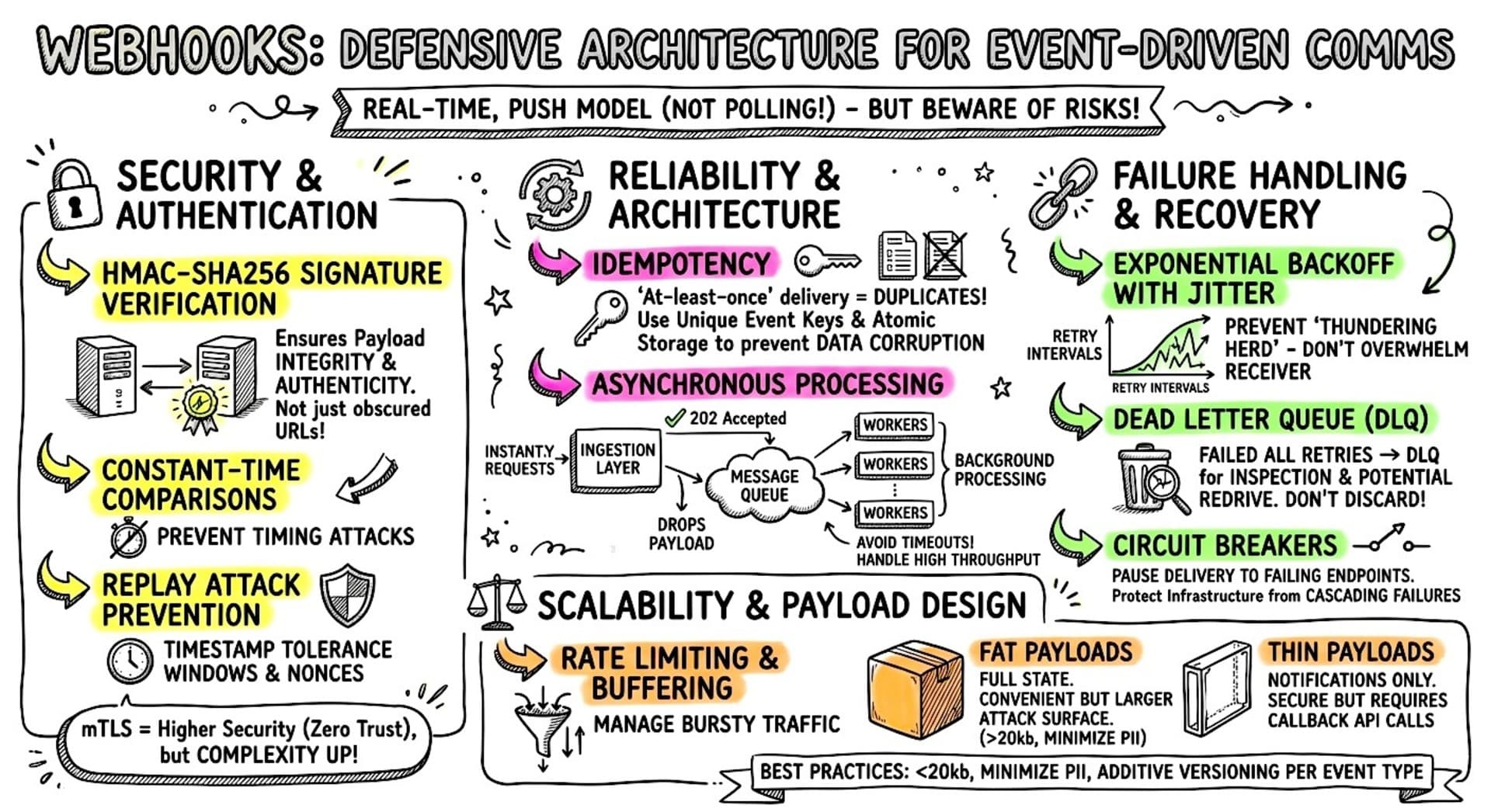 Webhooks facilitate real-time, event-driven communication between systems but require a defensive architecture to ensure security, reliability, and scalability. Unlike polling, webhooks utilize a “push” model, necessitating robust handling of network partitions, malicious activity, and traffic spikes.