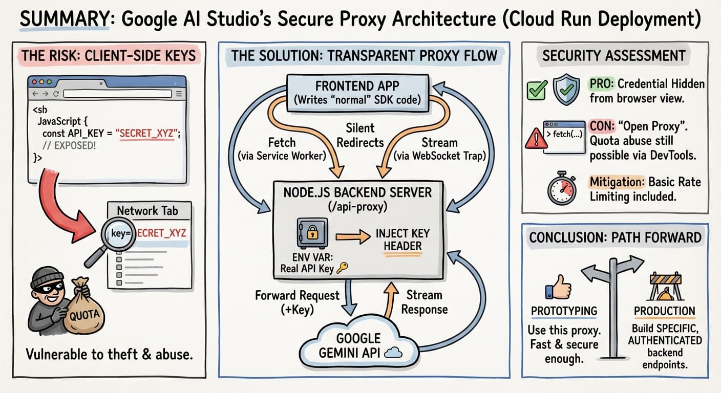 The Google AI Studio proxy server is a nice piece of engineering for prototyping and demos. It allows for a “serverless-feeling” frontend development experience while adhering to the basic security rule of keeping API keys on the server.