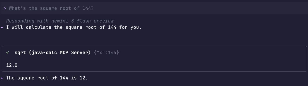Now, when you ask Gemini “What is the square root of 144?”, it will reach out to your JBang script, execute the Java method, and give you the answer.