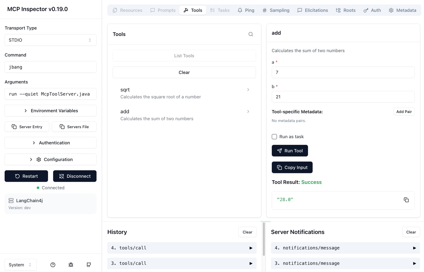Once the inspector is running, you can click to connect to the server, list the tools, select a tool, all in your browser, and watch your Java code execute in real-time.