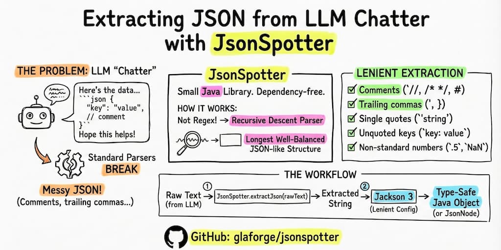 I wrote JsonSpotter to handle this. Itβs a small Java library that finds and extracts JSON-like structures from any text, even if the JSON itself is a bit messy. Then, you can use a lenient JSON parser like Jackson 3 to parse the extracted JSON to work with proper type-safe Java objects, instead of text or maps of lists of maps of… more basic types.